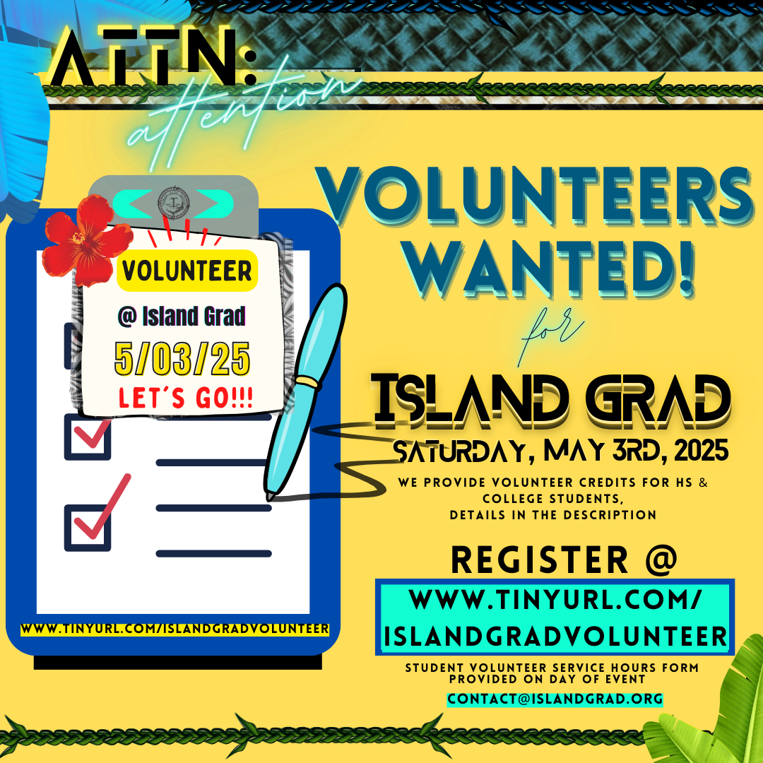 We are looking for volunteers for our 2025 Island Grad Ceremony! Slots are available before, during, and after the ceremony. If you are a student, this volunteer opportunity counts as community service hours! Thank you for your willingness and support. Your presence is much needed and we look forward to meeting you! click on the image above to register!